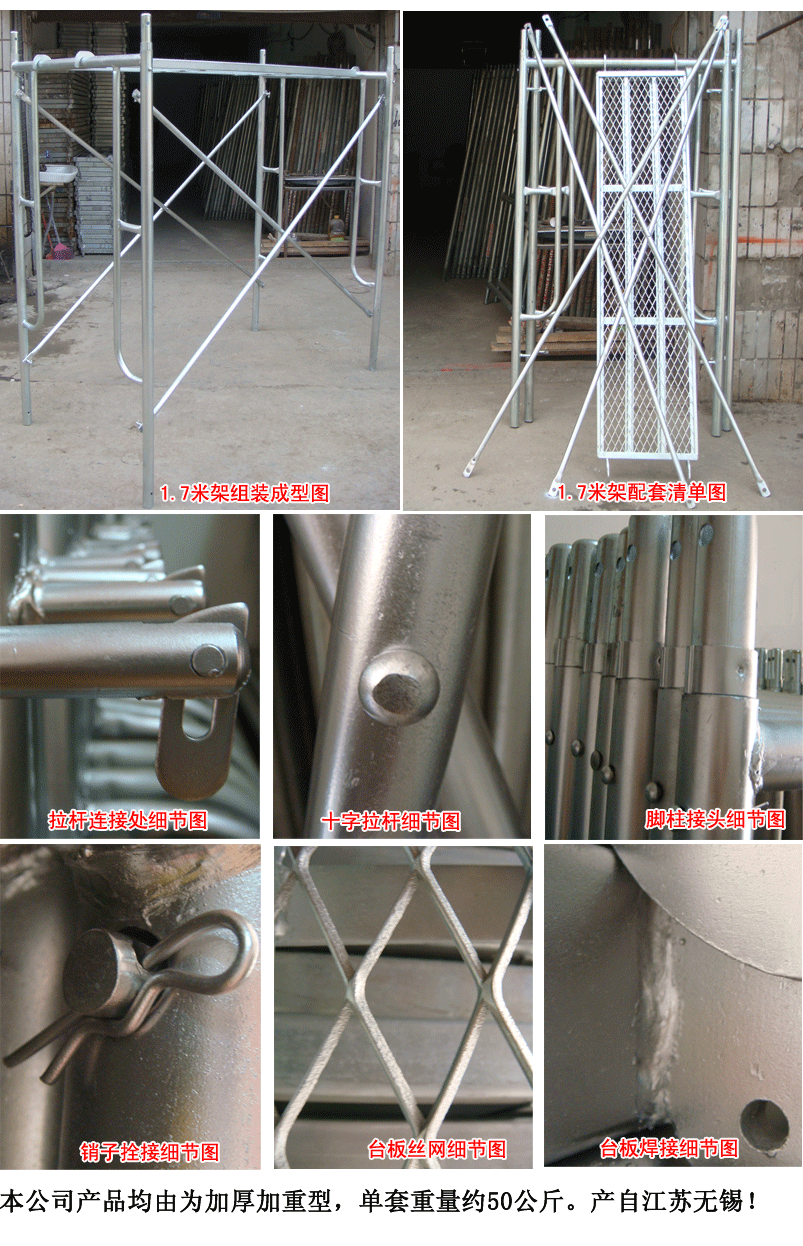門框架式腳手架也被稱為門鋼管腳手架,門框架首先構成基本單元,其主要部件包括門框架、交叉支撐和水平梁框架,門桿垂直方向選擇連接桿和鎖臂高度,垂直使用交叉支撐連接門柱,在頂部平面使用扣腳手板或水平梁框架。這些基本的組合模塊相互連接,堆疊高度,上下伸展,然后設置水平加固件、剪刀支撐和墻桿,形成整體的門腳手架。這種腳手架的組成非常簡單,尺寸和規格也很多,我們必須根據門腳手架的尺寸來設置。